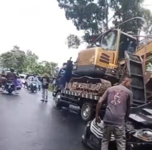 Sekilas Lampung — Kecelakaan lalu lintas yang melibatkan kendaraan berat dan mobil pribadi terjadi di ruas Jalan Raden Imba Kesuma, Kecamatan Tanjung Karang Barat, Kota Bandar Lampung, pada Rabu (1/4). Insiden ini melibatkan sebuah truk pengangkut alat berat jenis ekskavator dengan satu unit mobil sedan Toyota Vios.