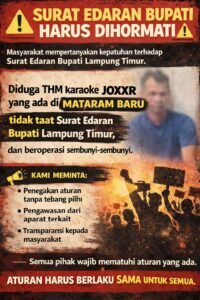 Sekilas Lampung //Lampung Timur – Dugaan masih beroperasinya tempat hiburan malam di wilayah Mataram Baru, Lampung Timur, Indonesia menjadi perhatian masyarakat serta organisasi kemasyarakatan. Aktivitas tersebut dinilai bertentangan dengan kebijakan pemerintah daerah yang tertuang dalam Surat Edaran Bupati di Lampung Timur, Lampung, Indonesia terkait pengaturan operasional tempat hiburan malam, terutama selama bulan Ramadan.