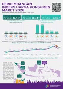Sekilas Lampung — Perkembangan Indeks Harga Konsumen (IHK) pada Maret 2026 menunjukkan tren inflasi yang tetap terkendali, baik di tingkat nasional maupun daerah. Data resmi yang dirilis Badan Pusat Statistik mencatat inflasi bulanan (month-to-month) sebesar 0,41 persen, inflasi tahun kalender (year-to-date) sebesar 0,94 persen, dan inflasi tahunan (year-on-year) sebesar 3,48 persen.